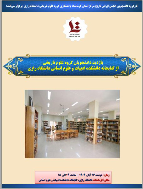 کارگروه دانشجویی انجمن ایرانی تاریخ مرکز استان کرمانشاه با همکاری گروه علوم تاریخی دانشگاه رازی در تاریخ 26 آبان 1404 – ساعت 14 الی 15 بازدید دانشجویان گروه علوم تاریخی از کتابخانه دانشکده ادبیات و علوم انسانی دانشگاه رازی را در نظر گرفت.